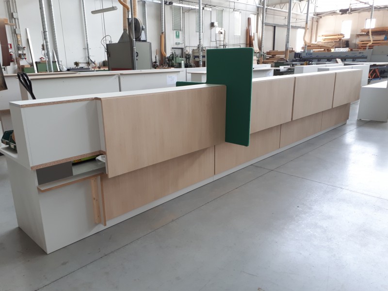 Zone comuni e banconi operativi realizzati nel 2019 per struttura ospedaliera. Materiali utilizzati melaminico e laminato su supporto ignifugo.